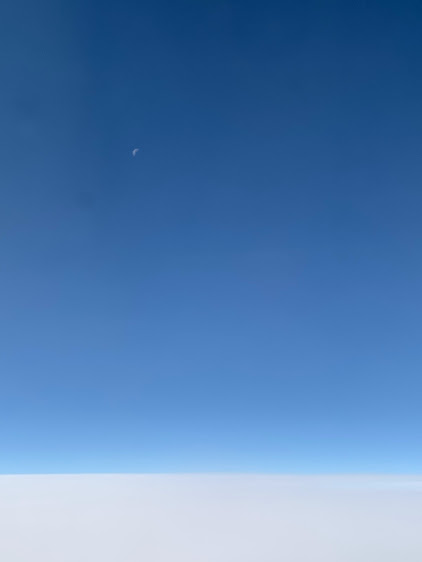 写真は飛行機の中から。上の白ポツは三日月ですよ。
